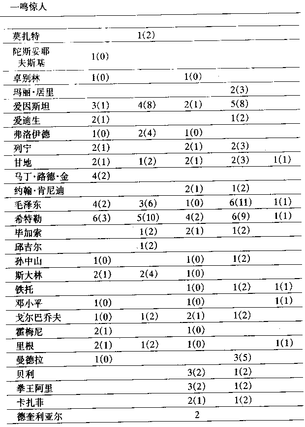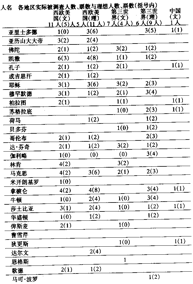 我們可以分几類人物來總結調查結果,看哪些人最有名。調查結果應由兩點決定:預計票數与名人已卒年數。 古代人物,已卒年數約為2000年。由于這些人的已卒年數接近2000年,可以把他們的已卒年數看成大致相同。從得票多少來看,這些人的排列次序為:凱撒、亞里士多德、孔子、佛陀、耶穌、亞歷山大大帝、蘇格拉底、柏拉圖。如果再考慮到已卒年數,頭三人的已卒年數分別為2033、2201、2468,那么,凱撒、亞里士多德和孔子的名气大致是一樣的。依此考慮,佛陀和耶穌的名气是一樣的。蘇格拉底的名气要比柏拉圖大,亞歷山大大帝的名气要比蘇格拉底大。 我對調查結果持一定程度的保留意見。我認為,在上述這批古代人物中,名气最大的應當是耶穌。在世界各大國、各主要國家,耶穌的名气家喻戶曉。在中國,不少目不識丁的百姓和未長大成人的青少年都听說過耶穌的名字。在其他基督教并不盛行的國家,情況也大致相似。在基督教國家,如西歐、美洲、東歐、蘇聯,絕大多數成年人都知道耶穌是誰。凱撒、亞里士多德和孔子都不可能有如此大的知名度。 古代人物,已卒年數遠遠不到2000年。只有兩人,穆罕默德和成吉思汗。 近代人數,已卒年數在200年以上。我覺得200年是個重要的年數。各位名人在死后200年內,名聲變化最大,變化的反复也很厲害。過了約200年,名人的歷史地位和功過便基本上有了客觀与准确的評定。許多政治家,如列宁、毛澤東,過了200年,他們的功過得失才能為世人認識清楚。大思想家的思想只有在200年后才能看清其命運与生命力。 近現代人物,已卒年數在100∼200年左右,共8人。 近現代人物,已卒年數不足100年。此類人物的得票數(特別是政治家)在100—200年內會有大幅度下降。 活著人物。到1989年5月時,霍梅尼還健在,故他被歸入活著人物類。 現將這些名人排列于下面,次序是按票數与已卒年數而定的。 1.已卒約2000年的名人:耶穌、凱撒、亞里士多德、孔子、佛陀、亞歷山大大帝、蘇格拉底、柏拉圖。其他:荷馬、奧古斯都、克列奧巴特拉、希帕克拉底斯、漢尼拔、摩西、秦始皇、老子、斯巴達克、阿育王。 2.已卒1000∼2000年的名人:穆罕默德。其他:李白、查理大帝。 3.已卒200年以上人物:哥倫布、莎士比亞、牛頓、達·芬奇、伽利略、馬可·波羅。其他很難排序的人物有:巴赫、笛卡爾、但丁、亨利八世、黑格爾、伊麗莎白女王、李世民(僅在中國)、馬丁·路德、路易十四、馬基雅維里、彼得大帝、拉斐爾、伏爾泰、迪迦馬、米開朗基羅、詹姆斯·庫克、忽必烈、洛克、易卜拉欣漢(在阿拉伯世界)、曹雪芹。 4.已卒100—200年左右人物:拿破侖、馬克思、華盛頓、林肯、貝多芬、莫扎特、達爾文、歌德、恩格斯、俾斯麥、狄更斯。 其他難以排序的人物:巴爾扎克、玻利瓦爾、陀思妥耶夫斯基。法拉第、加里波第、杰佛遜、麥克斯韋、南丁格爾。 5.去世不足100年人物:希特勒、愛因斯坦、列宁、毛澤東、斯大林、甘地、弗洛伊德、瑪麗·居里、畢加索、愛迪生、邱吉爾、約翰·肯尼迪、馬丁·路德·金、鐵托。 其他:第一批:柴可夫斯基、凡·高、托爾斯泰、怀夫漢南達(僅在印度)、巴甫洛夫、卓別林、伊藤博文。 第二批;羅斯福、墨索里尼、羅曼·羅蘭、格瓦拉、納賽爾、恩克魯瑪、赫魯曉夫、周恩來、勃列日涅夫、阿加莎·克里斯蒂、亞歷山大·貝爾、伊麗莎白·泰勒、加加林、諾貝爾、萊特兄弟。 第三批:帕爾梅、杜魯門、約翰·列農。 6.活著人物:戈爾巴喬夫、曼德拉、鄧小平、里根、貝利、拳王阿里、卡扎菲、霍梅尼、撒切爾夫人、伊地·阿明、阿拉法特、阿基諾夫人、布什、卡斯特羅、邁克爾·杰克遜、尼克松、教皇約翰·保羅二世、聯合國秘書長德奎利亞爾。 (三)什么樣的人最有名气 綜上調查結果,最負盛名的人物是: 1.大宗教的創立者。耶穌、佛陀和穆罕默德。 2.大圣賢或大思想家。古代的亞里士多德、孔子、柏拉圖、蘇格拉底,近代的馬克思,還有名聲稍小的恩格斯和列宁,現代的弗洛伊德。 3.大政治家。主要是: 1)世界征服者,如拿破侖、亞歷山大大帝、成吉思汗、希特勒。 2)大國創立者,大國的獨立運動領導人或大國主要政治体制的創立者。前者如華盛頓、印度的甘地、南美洲的玻利瓦爾,后者如列宁、毛澤東。 迄今為止,上述三种人最具盛名。除這三种人之外,較具盛名的人物有: 1.大探險家。近代的哥倫布、麥哲倫、馬可·波羅,現代的加加林、阿姆斯特朗。但現代探險家名气遠不如近代探險家。 2.文藝領域最杰出人物。最突出的文學家(如莎士比亞、歌德、托爾斯泰)。最偉大的畫家(如達·芬奇)、最出色的音樂家(如貝多芬、莫扎特、巴赫)。 3.最偉大的自然科學家,主要是物理學家(如牛頓、愛因斯坦。林利略)和生物學家(如達爾文、巴斯德、巴甫洛夫),其次才是化學家(如居里夫人和諾貝爾)和發明家(如愛迪生、亞歷山大·貝爾和萊特兄弟)。 4.領導种族解放運動的大政治家(如林肯)、鐵腕或專權的大國政治家(如斯大林、墨索里尼)。領導強國贏得重大戰爭胜利或治理大國卓有成效者(如邱吉爾、羅斯福、伊藤博文、約翰·肯尼迪、周恩來、戈爾巴喬夫)。 5.宗教改革的重要人物。如馬丁·路德、加爾文。 其他能引人注目的人物有: 1.領導种族解放運動的著名政治家,名气小于林肯,如馬丁·路德·金、曼德拉