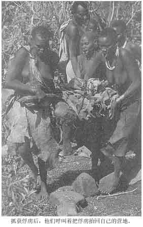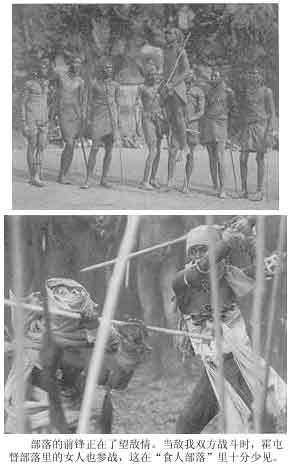 霍屯督人尚武好斗,這令威爾遜等人感到有些茫然不解。這些霍屯督人對戰爭并不懼怕,也不陌生,部落之間的戰斗經常出現,搶劫牛群,誘騙婦女,侵犯領土等事件,往往都是戰斗的序曲。類似事件發生后,受害者一方往往派出一名使者向對方提要求和賠償价格,如果對方接受這些要求,便可以息事宁人,如果對方不接受條件,惡戰即將開始,全部落的男人在酋長的率領下前去劫寨。出發之前,那些沒殺死過敵人的戰士要喝牲畜的血,并利用占卜術求得吉兆。他們的戰術往往是突襲并利用公牛助戰,一般都偷偷地藏在水源附近,通常,在這种情況下,對方早有防備。這時复仇者保持一定的距离進行箭攻,然后步步逼近,最后雙方進行交手戰。他們的武器則是長矛和圓木棒,有時手上還有一种防身的牛皮衣,這是用雙層生牛皮制成的。在最激烈的時候,他們有時赶出公牛与敵人戰斗。