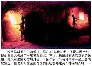 ![]() 在特异功能大師榮松的指點下,潛水員再次下水,僅僅几分鐘時間, 他們便全都浮出了水面——這一次,他們的确找到了“那智號”的殘骸。 當年,除了那1000多名士兵,隨同這艘巡洋艦一齊沉入水底的,還有100吨 黃金和難以數計的各式珍寶。 ![]() 正當丸山正雄葬身大海、福光稔和美國中央情報局秘密小組的小分隊在布滿骷髏的地洞深處搏殺得血流成河的時候,馬科斯卻鑽了空子。他知道他們在干什么,這也正是他所希望的。他知道,數目巨大的山下奉文藏金,他不可能一個人獨吞,必然要挪出一部分來,讓其他人去挖掘。現在,日美雙方爭斗起來了,他就可以從中得利,加快自己的挖掘步伐。 1958年,馬科斯開始了他真正意義上的第一次行動,他首先把挖掘的地點定在博尼法西奧城堡。 這里,曾是麥克阿瑟將軍的司令部所在地。因此,在城堡的中央,軍官禮堂旁邊麥克阿瑟的住所,有一條環形車道,車道的一頭就通往將軍私人避彈所的入口,相當堅固。日本人占領該城堡之后,加修了很長的地道。戰爭結束前夕,這些地道又被堵上了。因此,馬科斯堅信日本人肯定會把黃金藏在這城堡之下。 一旦認定下來,他就開始了行動。 他使盡各种下腕,從軍方弄到了2000多名士兵,沿著這個地道向前和向下挖掘。 据有關資料說,馬科斯沿著這個地道挖掘,共挖了5年多時間,一共挖了35英里長,卻只找到了少量的金條。 我們有理由相信,2000多士兵挖一條35英里長的地道——何況這地道是現成的,只不過被堵了一下,但畢竟比初次挖掘起來要輕松得多——不至于需要5年的時間。之所以如此,只說明了一點,那就是馬科斯的人碰到了丸山正雄和福光捻他們一樣的麻煩,換句話說,他們在那里找到子大量的金條,同時也遇上了暗道机關、骷髏迷陣。 ![]() ![]() 事實正是這樣。馬科斯在博尼法西奧城堡下面共挖了5年時間,結果,2000多士兵只剩下了不到400人。我們知道,這一帶是儿玉譽士夫埋下的寶物,雖然當時各方面的防御措施還不及后來完備,但是,打開保險的烈性炸藥是有的,門頂陷阱也少不了,唯一不同的是,骷髏陣中所暗藏的殺机要比后來的少一些。馬科斯在博尼法西奧城堡中到底找到了多少黃金,沒有人統計過,但据他后來擔任總統時的衛隊司令官、同時也是這次挖掘工作的實際指揮者法維安·貝爾事后說,工程結束之后,好几位參觀者曾在馬科斯在巴丹海灘修建的地下室里,看到了一層一層多得令人難以置信的金條。后來,一些買主和中間商又在馬拉卡南宮附近一個巨大的地下儲藏室里看到了同樣數量巨大的金條。 ![]() ![]() 如果不是從博尼法西奧城堡之下挖出了寶藏,就無法解釋馬科斯在一夜之間何以來這么多的黃金。 大約在1975年春天,此時的馬科斯已在菲律賓共和國總統的寶座上呆了整整10年的時間。一天,他突發奇想,想在圣地亞哥古堡的下面進行挖掘。圣地亞哥古堡是馬尼拉著名的建筑,也是馬尼拉的主要旅游景點之一,一年四季,游人如織。要在這里挖掘,如果沒有一個万全的理由,是很難進行的,因為一動工就必然影響旅游業,民眾那里是通不過的。 ![]() 這時候,馬科斯的一個手下為他解決了這一難題。 那人提出了一個建議,即假借第一夫人修复古物的名義來開展這一工作。第一夫人喜歡賣弄自己能歌善舞的本領,常常以重視文化娛樂設施建設与保護的姿態出現,這在菲律賓乃至全世界都是出了名的,一度時期,因為她的這些舉動,還曾博得過菲律賓國民的好感。准不希望把自己的家園建設得漂亮一些堂皇一些呢?准不希望自己的國度能吸引更多的外國游人呢?因為只要能吸引外國人,就有可能賺更多的錢。如果找這樣一個理由,既可博得民眾的擁護,更不會招致必須避免的怀疑。 馬科斯依計而行,果然湊效,沒有任何人提出异議。 挖掘一個博尼法西奧城堡,馬科斯耗時5年多,而且,按他的說法,還沒有挖出多少金條……圣地亞哥城堡難道也要耗他5年多?這里是旅游熱點,不允許他這么干,不管怎么說,修复古物也不應該花去這么長的時間。再說,博尼法西奧城堡雖然“沒有挖出多少金條”,但總是有一些的,万一在圣地亞哥城堡挖了几年,竟一根金條也挖不出怎么辦?万一挖著挖著又碰響了那些烈性炸藥怎么辦?需知,如果碰響了那些東西,整個古堡就可能化為瓦礫!當年,沿著博尼法西奧城堡下的隧道前行的士兵,就曾葬身于那片火海之中,但由于爆炸點已遠离城堡近20英里,故而并沒有引起人們多大的注意。可如今卻不同了,如果圣地亞哥堡下面的隧道遠沒有35英里長,稍不注意就會功虧一貫,弄不好還會引火燒身——分明是以第一夫人的名義在修复古物,卻將古堡摧毀了,不僅第一夫人無法向世人交待,他馬科斯自然也脫不了干系,說不定,他的總統席位也要換人。總之,冒的風險太大了。 鑒于這种情況,有兩個問題需要馬科斯解決,一是要加快速度,一是要增加准确性。 ![]() 他和伊梅爾達請來了住在瑞典的心靈感應專家奧洛夫·榮松,讓他住進了馬拉卡南宮。 据說,奧洛夫·榮松是一個奇人,有很多書描繪過他的奇事,而且,都相當暢銷。那些書上,把他寫成了一個無所不知的神,說他具有一种超自然的力量:他有穿山的能力,能在一分鐘之內穿過阿爾卑斯山;他有隱身術,分明是跟你在一起談話的,可是,另一個榮松早已离你而去,干他想干的事情去了;他有預測的能力,可以在頭一年說出下一年世界上哪些河流