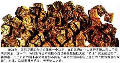 ![]() 1978年,國際貨幣基金組織作出一個決定,允許政府的中央銀行直接 從私人手里購買黃金,這一下,馬科斯再也不用擔心自己那些數額巨大的 “私儲”黃金的出路了。要知道,几乎所有的山下奉文藏金都不具備二戰 之后國際市場上通行的“倫敦黃金指紋印”。對此,馬科斯甚至感歎:天 無絕人之路! 對于馬科斯來說怎樣才能把那些黃金穩穩妥妥地再一次掩藏起來,使世人都不知情,直到最后,不得不承認那些東西本來就是屬于他馬科斯個人的,這實在是一個棘手的問題。 當然,馬科斯不可能把他歷經千辛万苦才從洞里挖出的黃金和珠寶,又像山下奉文和儿玉譽士夫等人一樣,將其再次埋進洞中。事實上也用不著了,因為他現在掌握著一個國家的大權,這些黃金,非法得來的也好,挖掘山下奉文藏金得來的也好,他都可以找到冠冕堂皇的理由來處理它們。他在很早以前,就建立起了一個橫跨太平洋的黃金渠道。 馬科斯黃金渠道的建立,是得到美國中央情報局的大力支持的,在他執政期間,大量“不明身分”的黃金被運出了菲律賓。這些黃金,雖然被鑄成菲律賓中央銀行或本格特礦出產的樣式,但其真實的來源卻是山下奉文藏金。中央情報局一面幫助馬科斯“銷贓”,一面不斷地派出特工人員,對馬科斯進行監視,監視的結果,除了馬科斯的性丑聞之外,并無什么新鮮的信息,最大的信息依然是他的黃金交易。當中央情報局的老爺們力圖干涉澳大利亞的內政時,馬科斯充當了一個貼心走狗的角色,他這樣做,是為了報答中央情報局在黃金外運方面為他提供的便利。据消息靈通人士說,中央情報局幫助馬科斯往澳大利亞運送黃金,一部分是送給那些中間派,拉攏那些牆頭草,使他們能在關鍵時候倒向自己一邊。据有關資料記載,有些黃金甚至是直接從美軍在菲律賓的克拉克空軍基地運往澳大利亞的,它們的主要運抵點是在高度戒備下的派恩加普美軍基地。那段時間,用不同方式偽裝起來的卡車,運送著黃金在軍事基地進進出出,如人無人之境。 可是,中央情報局一旦被迫停止了對澳大利亞的內政干涉,便放棄了這條后來被稱為努甘-漢德的黃金運送渠道,使馬科斯的外運計划立時受阻,弄得他像熱鍋上的螞蟻。他不得不迅速開辟出其他渠道來,否則,他的那些無以數計的黃金,會把他的馬拉卡南宮也裝得爆炸的!這樣,他就背著中央情報局干起了黃金交易。交易的數目之巨,使人難以置信。剛開始時,他還擔心有人會認為他不顧信譽,從而影響他以后的渠道暢通。好在中央情報局仿佛不計較這些,再一次對馬科斯伸出了援助之手,使他順利地建立起了從菲律賓到檀香山運送大批黃金的一條新渠道。他們之所以這樣做,一方面是為了施恩于馬科斯,把對方用金錢來縛住,另一方面,也是為了監視馬科斯的黃金交易,掌握他究竟有多少黃金。因為馬科斯黃金交易的數目之大,令中央情報局里的那些官員也認為是不現實的,甚至覺得是一种神話。根据材料證明,這條黃金渠道是由一個名叫羅恩·里瓦爾德的人負責的,他是一個馬球迷,在夏威夷開了一個馬球俱樂部。除羅恩之外,菲律賓的億万富翁銀行家恩里克·佐貝爾也幫了不少忙。佐貝爾是一個馬球手,在夏威夷的馬球俱樂部里,羅恩与佐貝爾相識了。有人調查證明,佐貝爾也是中央情報局的合作者,他們共同為那些身居顯赫要職的政府官員和富商巨賈保存他們的非法財產。而且,佐貝爾曾借給中央情報局數百万美元的鈔票,馬科斯也一定給中央情報局放過貸,不然,中央情報局為什么老是覺得自己欠了馬科斯的情,對他一再遷就呢? 光有從菲律賓到檀香山的那條渠道,對馬科斯而言是不夠的,正在馬科斯為自己的黃金渠道感到憂慮的時候,1978年,國際貨幣基金組織作出一個決定,允許政府的中央銀行直接從私人手里購買黃金。這一決定,為馬科斯把自己的私儲黃金換成便于保管的現金打開了方便之門。這一決定公布以后,菲律賓所有金礦出產的黃金都直接賣給了中央銀行,馬科斯便找了一個代理人,冠冕堂皇地把自己的黃金也賣給了中央銀行。這樣一來,不僅省去了許多麻煩,而且,再也不會引起什么人的怀疑了。一旦有了机會,這些黃金馬上就可以從中央銀行脫手到國際市場上。為了使自己的黃金能更順利地進入國際市場,賣出更高的价錢,1981年11月,菲律賓金融協會——其實就是馬科斯自己說了算一一宣布把“地方剩余黃金儲備“投放到國際市場上。在3個月時間內,大約有30万盎司“剩余”的黃金被運往香港、紐約、倫敦和蘇黎世,用于像賈雷博士所描述的“商業借貨”,在租借期內,菲律賓中央銀行与美國、英國、加拿大和西德簽訂了合同,這樣一來,馬科斯又為自己找到了一條出路。他甚至感歎:無無絕人之路! 有一些當時的資料透露說:……美國海軍陸戰隊司令P·X·凱利在華盛頓家中舉行了一次宴會。會上,一位以消息准确聞名的著名記者說他遇到了一個杰出的美國商務代理。后者曾是五角大樓下面一家承包机构的副總裁。這位代理把記者拉到一邊,向他出示了一張關于買賣馬科斯黃金合同的影印件,并告訴記者,他是通過他的一位朋友——一名退休的空軍上校而卷進去的。這位上校在若干年里不知飛到馬尼拉多少次,他已和許多在菲律賓的美國高級軍官交上了朋友。按這位上校的建議,商業代理以旅游名義到了馬尼拉。在那里他私下得知,馬科斯有若