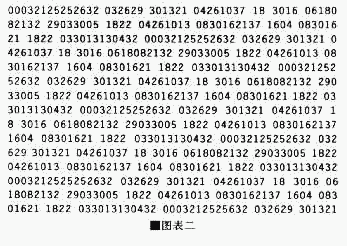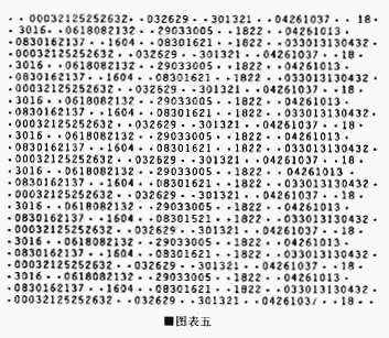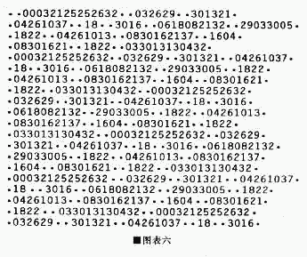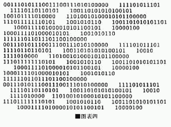 特德不耐煩地用指頭敲擊著控制台。 “這是很基本的,我親愛的巴恩斯,”哈里說道,“這一部分其實很簡單,困難的是——它所代表的意思。” “肯定是一條訊息。”特德說。 “也許是一條訊息,”哈里說道,“但也有可能是電腦內部釋放出來的,是程式設計錯誤或硬件故障的結果。也許我們必須花上几個小時才能把它破譯,而結果可能只是‘硅谷埃克米電腦公司版權所有’這類話。” “可是……”特德想插話。 “這些數列很可能是電腦內部產生的,”哈里說道。“不過還是讓我來試試看。” 蒂娜把屏幕上的數字打印出來給了哈里。 “我也來試試。”特德迫不及待地說道。 “好的,菲爾丁博士。”蒂娜說著又打印了一份給特德。 “如果是一條訊息,”哈里說道,“那它很可能是一种簡單的代碼,就像電腦代碼一樣。如果我們在這台電腦上先運行一個解碼程序,也許能得到一些幫助。有人會編制解碼程序嗎?” 大家搖搖頭。“你行嗎?”巴恩斯問道。 “不行,現在沒有辦法把這個東西傳送到上面去了吧?華盛頓國家保密局的譯碼破密電腦15秒鐘就能把它解出來。” 巴恩斯搖搖頭。“沒有辦法。現在連用气球帶一根無線電天線上去都做不到。最后一次气象預報時,他們說海面上有40英尺高的巨浪。天線一上去就會被沖斷。” “這么說我們現在是与世隔絕了。” “是与世隔絕了。” “我想我們又要回到鉛筆和紙的老方法上了。我總認為傳統工具是最好的——尤其是在其他東西都不靈的時候。”哈里說罷离開了房問。 “看來他的心情不錯。”巴恩斯說道。 “我認為非常好。”諾曼說道。 “也許好得過了頭,”特德說道,“有點儿狂躁?” “不是,”諾曼說道,“心情很好。” “我看他有點太過興奮。”特德說道。 “如果這种心情有助于他解釋這些代碼,那就不要去打扰他。”巴恩斯說道。 “我也來試著解解看。”特德說道。 “行啊,你也試試吧。”巴恩斯說道。 “我跟你說吧,像這樣把寶押在哈里身上是不對的。”特德不斷來回踱步,然后看著諾曼說:“哈里有點狂躁,而且他忽略了不少東西,很明顯的東西。” “何以見得?” “比方說,這份打印件就不可能是電腦所釋放的。” “你怎么知道?”諾曼問道。 “這台電腦的中央處理器,”特德說道,“是68090型,也就是說任何內存記憶轉儲都是16進制的。” “什么是16進制?” “表示數字有許多方法,”特德說道,“68090型芯片使用的是基-16表示法,即所謂“16進制”。16進制和普通的10進制截然不同,而且一看就能看出來。” “可是這上面使用的數字是從0到9。”諾曼說道。 “我正要講這個問題,”特德說道,“所以它并非出自這台電腦內部。我認為這肯定是來自那個大球的訊息。此外,雖然哈里認為這是一种代碼,但我認為這是一种直接的圖像表示。” “你是說一幅圖畫?” “是的,”特德說道,“我覺得它代表的就是那個生靈本身!”他開始在一張張文件中尋找。“我從這張開始吧。”(參照圖表四)