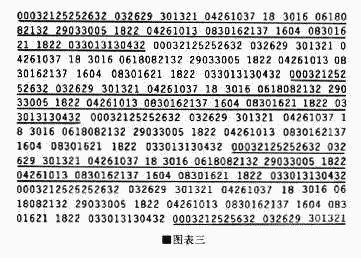 “你覺得是什么,哈里?”巴恩斯指著屏幕問道。 “你們以前看到的是不是也如此?”哈里問道。 “樣子像,但是間隔位置不一樣。” “這肯定是非隨机的,”哈里說道,“它是一种單數列的不斷重复。你看,從這儿開始到這儿,然后又重复。”(參照圖表三) “他說得對。”蒂娜說道。 “真不可思議,”巴恩斯說道,“真是神奇,你竟能看出這個名堂。”