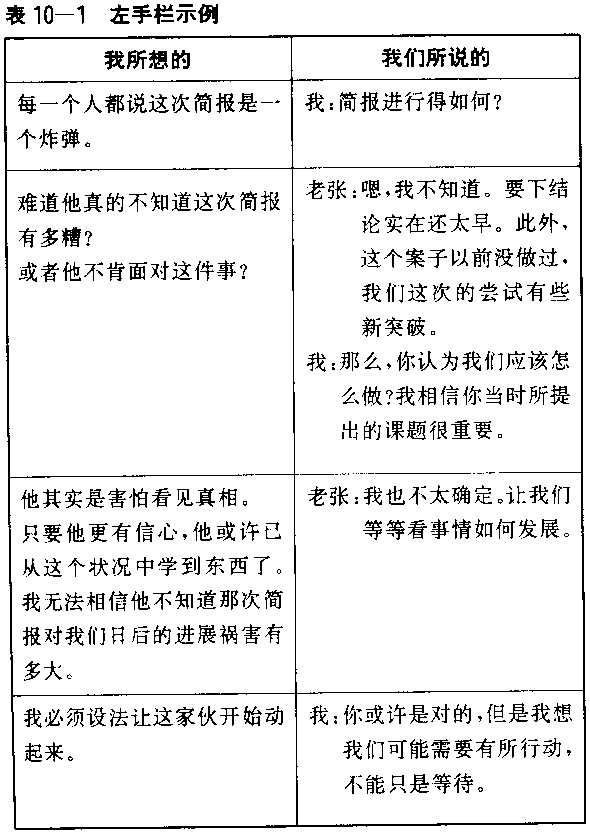 老張答:我也不太确定。讓我們等等看事情如何發展。 我問:你或許是對的,但是我想我們可能需要有所行動,不能只是等待。 現在讓我們把這段交談用“左手欄”的方式呈現如表10—1所示。 練習“左手欄”經常可成功地將隱藏的假設攤出來,并顯示這些假設如何影響行為。在上述的例子中。我對老張作了兩項關鍵假設:第一,他缺乏信心,特別是當他正視自己不佳的表現時;第二,他不夠主動。兩項假設或許都不對,但是在我自己內心的對話中可以明顯看出來,這兩項假設都影響我對情況的處理方式。由于我認為他缺乏信心,害怕如果我直接說出來,他將喪失僅有的一點點信心,所以我未將真正想法說出。當我們談論接下來做什么的時候,我認為老張缺乏主動精神的看法浮上心頭。因為盡管我提出問題,他并沒有說出明确的行動路線。我把這看作是他懶惰或缺乏主動精神的證据。由此种种,我歸結:自己必須設法產生某种形式的壓力,激勵他有所行動,否則我只好親自動手做這些事情。 看清我們自己的“左手欄”所得到最重要的教訓,就是我們如何喪失在沖突狀況中的學習机會。老張与我并未坦然面對問題,而是繞著主題的邊緣說話。我們本應決定接下來該如何解決問題,結果卻在沒有明确行動方針的情形下結束交談,甚至不曾認清這是一個屬于需要行動的問題。 為什么我不直接告訴老張我認為有問題?為什么我沒有說出我們必須檢討該采取哪些步驟,才能使我們的專案能夠順利進行?或許是因為我不确定要如何以有建設性的方式提出這些敏感的問題。就如同前面所提亨利的同事一般,我以為提出來會引發防衛性的、反效果的相互指責。我害怕情況會比現在還糟。也有可能,我避免提出這些問題,是出于禮貌或不想逼人太甚。無論原因如何,結果是我對這次的交談并不滿意,以致于想要訴諸更有效的方式來激勵老張,使他有些積极的反應。 就像我跟老張的交談那樣,處理棘手的狀況,并沒有哪种模式一定是對的。但是先看清自己在未來可能使情況惡化的推論与行動,是有很大益處的。這便是“左手欄”的效用。一旦更清楚地看見自己的假設,以及我是如何被這些假設所障礙,我就可能使交談進行得更有效益。無論是哪一种方法,基本上都要分享彼此的看法和它們所依据的原始資料。此外,有可能老張不認同我的看法和數据,也有可能我的看法和數据根本是不正确的(因為告訴我老張簡報不佳的那位同事可能有所偏頗),我都需要隨時保持一种開放的態度來面對。重要的是,我應該把情況轉變成老張和我都能夠從中學習。這需要我能夠清楚誠懇地說明自己的看法,并了解溝通對象的看法,亦即一個阿吉瑞斯稱為兼顧探詢与辯護的過程。 二、兼顧的探詢与辯護 大多數的管理者都被訓練成善于提出与辯護自己的主張。在許多公司,所謂有才干的管理者,就是要能解決問題,想出需要采取什么行動,并獲得完成工作所需要的支援。在企業組織中;往往重視辯才無礙、影響力或其他才能,探詢的技巧卻被忽略。當管理者晉升到高階職位,他們遭遇的問題比個人經驗所能涵蓋者更复雜、更多樣化,他們更需要深入了解別人的想法以及學習。管理者辯護的技巧有時反而會產生反效果——會把我們封閉起來,無法真正相互學習。我們所需要的,是綜合運用辯護与探詢,來增進合作性的學習。 但是兩個善于為自己主張辯護的人,即使在一起開放、坦率地交換看法,也不一定會有什么學習的效果。他們或許真正開始對對方的看法感興趣,但是仍抱持全然的辯護心態,這樣所產生的交談結果如下:“我欣賞我的真誠,但是我的經驗与判斷讓我得到的結論不同。讓我告訴你,為什么你的建議行不通”“———— 最初每一方都理性而心平气和地為自己的觀點辯護,但只要辯護較為強烈一點,局面就會變得愈僵。缺乏彼此探詢的辯護過程,只會產生更強烈的辯護。有一個對立情勢逐漸升高的增強環路(如圖10—1所示),可以描寫接下來的發展,它跟前面圖5—1所提軍備競賽的結构一樣。