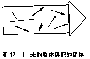 波士頓賽爾提克籃球隊的球員羅素(Bill Ruesell)曾經如此描寫他們的球隊:“就像其他專業領域一樣,我們也是由一群專家組成的團体,我們的表現依靠個人的卓越以及團体的良好合作。我們都了解彼此有互相補足的必要,并努力設法使我們更有效地結合……。然而有趣的是,不在球場上時,按照社會的標准來看,我們多數是古怪的。絕不是那种能跟別人打成一片,或者刻意改變自己來迎合別人的人。” 羅素告訴我們,使他的球隊打起球來与眾不同的,不是友誼,而是一种團体關系。大伙儿在球場上的配合,使團体產生登峰造极的演出,那种高度的默契,難以用筆墨來形容,几乎像慢動作般的清楚,任何神奇的妙傳或投射都可以發揮到不可思議的境界。 潛在的團体智慧 羅素所屬的球隊(在十三個球季中得過十一次NBA總冠軍)呈現出一种我們稱之為“整体搭配”(alignment)的現象,即一群人良好地發揮了整体運作的功能。然而在多數的團体里,成員各自朝向交錯的目標努力。如果我們為這种團体畫一幅圖,看起來可能像是圖12—l所示。
