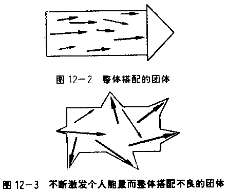 未能整体搭配的團体,許多個人的力量一定會被抵消浪費掉。個人可能格外努力,但是他們的努力未能有效地轉化為團体的力量。當一個團体更能整体搭配時,就會匯聚出共同的方向(圖12—2),調和個別力量,而使力量的抵消或浪費減至最小,發展出一种共鳴或綜效,就像凝聚成束的雷射光,而非分散的燈泡光;它具有目的一致性及共同愿景,并且了解如何彼此截長補短。