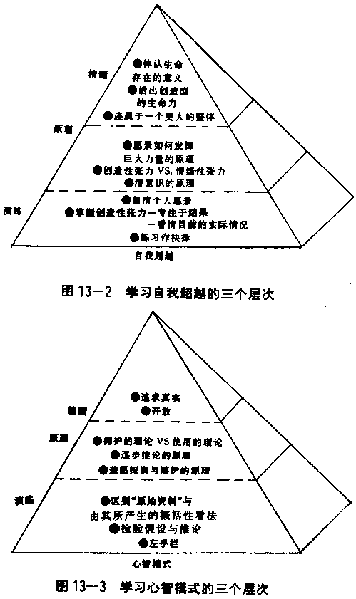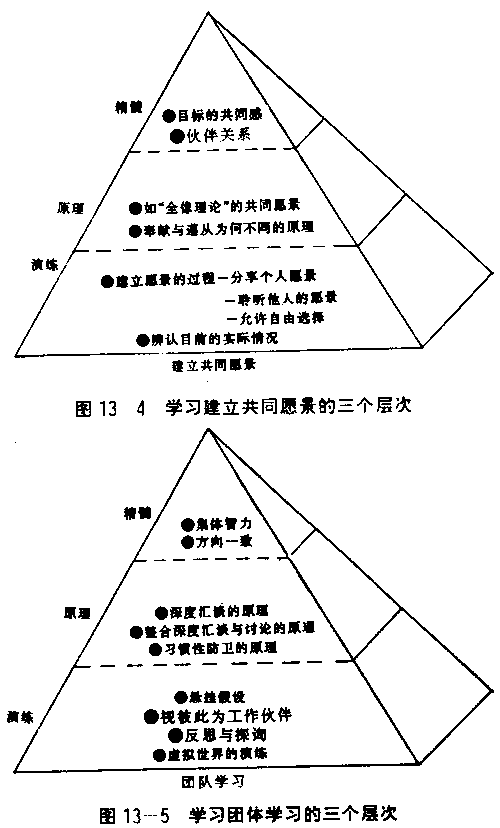 ●演練:具体的練習。 ●原理:指引的概念。 ●精髓:修煉純熟的人所處的境界。 在“演練”的層次上,修煉的學習者把時間及精力專注在一些活動上。譬如:系統思考需要搭配系統基模的使用,以看清复雜情況背后的結构。自我超越需要搭配“厘清個人愿景”及“掌握住創造性張力”;同時專注在愿景及現況上,讓兩者之間的張力產生實現愿景的力量。心智模式的運用,則需要區分所覺察到的直接“資料”,以及由這些資料所衍生的概括性的想法。 演練的功夫是每一項修煉最具体的部分,也是個人或群体開始從事一項修煉時的主要焦點。初學者因為還不習慣這种演練,所需要的是嚴格的“自我要求”,才能專注与持續。例如初學運用心智模式的人,在与人激辯時,必須下點工夫審視自己所作的假設,及為什么作這樣的假設。初學者對于一項修煉所作的努力,往往需要經過一段時間才看清自己所做的;例如在与人辯論之后,才會真正看清自己的假設,并區分假設与原始資料之不同。然而在演練久了之后,這些修煉后來會變成愈來愈自然,并能即時主動反應。那時你將發現自己在面對急迫的問題時,能夠自發性地想到系統基模,因而重建愿景,并看出自己行動背后的假設。 在修煉背后的“原理”也同樣重要,原理代表演練背后的理論。例如“結构影響行為”是系統思考背后的中心原理;而复雜的系統對于改變它們的努力有抗拒傾向,也是一樣重要的原理。前者是指影響實際狀況的能力,來自看清控制行為和事件背后的結构;后者是指直接控制行為的努力(例如為都市低收入戶建住宅這類用意良好的計划),通常所帶來的改善只是短期的,長期而言卻帶來更多的問題。同樣的,愿景的力量,以及區分“創造性張力”与“情緒性張力”之間的差异所在,都是“自我超越”的原理。 修煉背后的原理對初學者和精熟者都很重要。對初學者而言,這些原理有助于他們了解修煉背后的理論基礎,如演練這些修煉的意義。對精熟者而言,這些原理是參考點,有助于修煉的演練精益求精,和用來向其他人解釋這些修煉。 熟習任何一項修煉,需要在了解原理和篤實地演練這兩個方面都下功夫,認清這一點十分重要。我們很容易只了解一些原理,就自以為已學成該項修煉,誤將知識上的了解當作學習。學習必須產生新的了解和新的行為。這正是將原理与演練加以區分的理由,二者缺一不可。 第三個層次“精髓”与前兩個層次不同。學習一個修煉,如果把努力的重點放在這些精髓上面,就像憑空体驗愛、喜悅或宁靜的感覺一般,并沒有什么意義。修煉的精髓是指修煉純熟的個人或群体,所自然体驗到的境界。雖然這些体驗難以形諸筆墨或言語,它們對于深入了解每一項修煉的意義与目的是絕對必要的。每一項修煉都會改變學習者的某些基本習性。這便是為什么即使有些修煉的演練必須以合作的方式進行,但我們仍稱之為個人修煉的理由。 例如,系統思考能夠使人對生命的一体感產生愈來愈強烈的体驗,并且使人的視野從看部分改變為看整体。只要家庭或組織出現問題,系統思考造詣高的人,會很自然地看出問題的起因是背后的系統結构,而不是個人的錯誤或惡意。同樣的,“自我超越”能夠使人提高對自我生命存在的意義之体認,察覺此刻發生在我們內部和外部的事情,以及對于實現心中真正的愿望与掌握生命中的創造能量。 各項修煉在精髓的層次開始愈來愈相近(如圖13—1所示),有一种共同的体認將各項修煉結合起來,也就是一种覺得在心靈上相互依存的世界中,不斷學習的体認。各項修煉之間依然存有差异,只有差异變得愈來愈細微。譬如系統思考的一体感,強調万事万物彼此相互關連;而自我超越中也強調察覺自身不能与這個世界分開;另外,共同愿景中強調成員對團体目的的共同感,与團体學習的修煉中強調方向一致,也有异曲同工之妙。這些差异雖然微妙,卻很重要。就如同品酒專家能夠察一般人無法分辨的、真正好洒的差异,修煉造詣層次高的個人或組織。也一樣能夠分辨對初學者可能不明顯的差异。