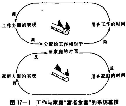 1990年《財星雜志》有一篇標題為“為什么評分得A的主管卻是評分得F的父母”的封面故事;据觀察,成功主管的子女比較可能發生情緒与健康問題。譬如密歇根大學的一項研究發現,在同一家公司,主管的子女每年有36%接受精神异常或濫用藥物的治療,非主管的子女只有15%。報告中又指出,主管長時間工作与個人特質(完美主義、沒有耐心、講求效率)是問題子女的元凶,并忠告精力充沛、對人我要求甚苛的管理者,需要學習如何不傷害子女的自尊与自信。然而,有趣的是,報告中并未提及為什么主管有效管理組織的方式,對于身為父母的角色毫無幫助?似乎該文作者也和我們大多數人一樣,完全接受工作与家庭生活互相沖突是不可避免的事實,而人所處的工作環境和組織,對于改善工作与家庭的不均衡狀態完全未扮演任何角色。 全面自我超越 近年來我注意到,在我們的領導与自我超越訓練課程的學員之中,對工作与家庭課題的關切顯著增加。“如何找到自己工作与家庭的平衡點”,現在也成為最多學員排在第一优先的課題。 無可否認的,傳統的組織會促成工作与家庭之間的沖突。有些是由于個人為了成就事業,愿為工作而犧牲;有些則是由于工作上的需求与壓力,無可避免地使家庭和工作的時間分配上發生沖突。這些工作上的需求包括出差、晚餐會議、早餐會報、周末外訓,或甚至習慣性的長時間滯留在公司。那些壓力則主要起于組織的眼光狹窄,將個人的目標完全排除在外:組織的目標就是一切,而不去衡量組織目標對個人或家庭造成的損失。 我相信學習型組織的各項修煉,將打破在企業中討論兼顧工作与家庭這項主題的禁忌。如果學習型組織不能支持生活中每一個面向的自我超越,就無法支持真正的自我超越。如果不能喚起個人愿景,它就無法促成共同愿景。而個人愿景是多面向的,它包括對個人、專業、組織与家庭生活的深深渴望。工作与家庭之間的人為界線,從系統思考的觀點來看是毫無道理的,一個人的工作与生活的其他面向之間,本來就是環環相扣的。 成功主管·問題家庭? 在工作与家庭不均衡的背后有一個系統基模。這個基模稱為“富者愈富”(Success to the Successful),它包括兩個增強環路(圖17—l),分開來看,每一個環路都傾向于逐漸成長,但卻爭用同一個資源。在這基模的背后,個人、群体或組織不斷地為一項有限的資源而競爭。成功的一方,因為其所在优勢,傾向于得到更多的資源,而其他競爭者的資源則相對地減少。這些資源可能是多個事業部門競相爭取的有限投資金額;也可能是一間坐滿學生的教室中,某位老師有限的贊美;或者是一位忙碌的管理者有限的時間。